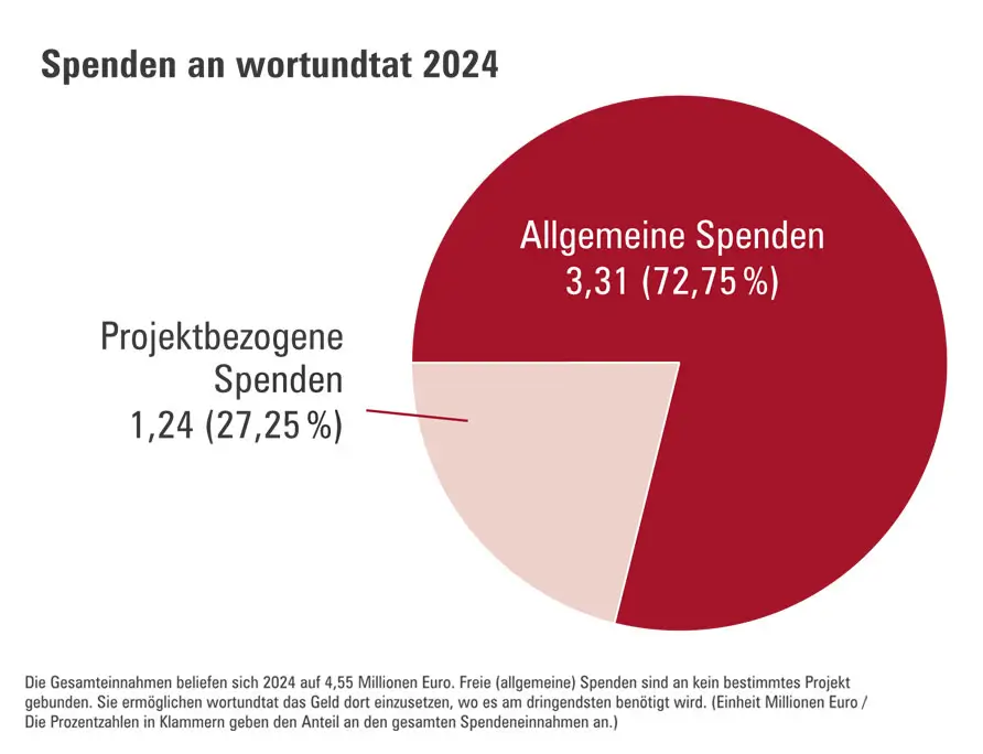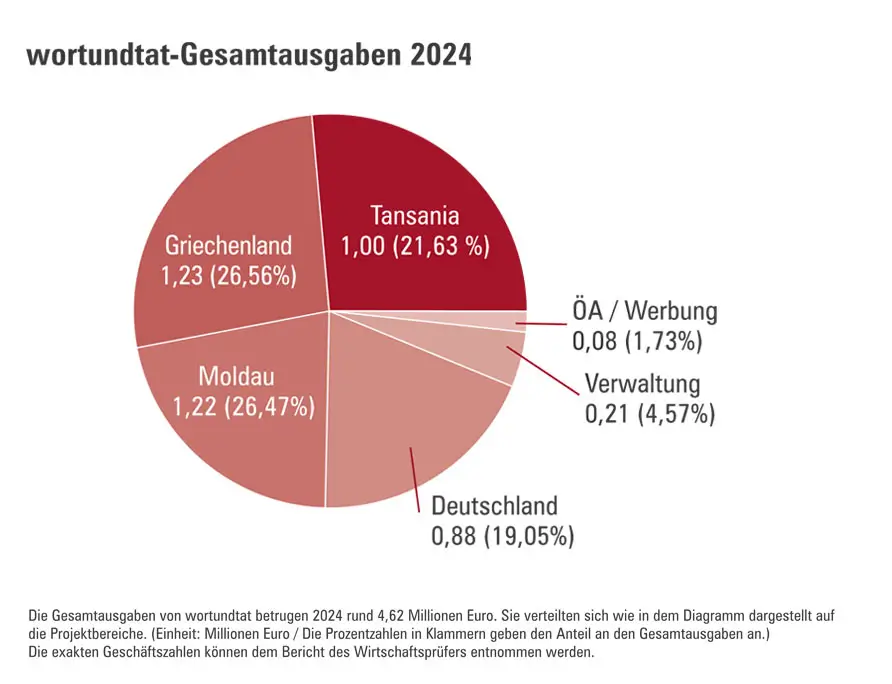 wortundtat hat im Jahr 2024 mehr als 4 Millionen Euro im In- und Ausland investiert und war dabei vor allem auf Konsolidierung bedacht. Von der Summe flossen 96 Prozent in die Projekte. Rund 290.000 Euro entfielen auf Verwaltung, Werbung und Öffentlichkeitsarbeit.